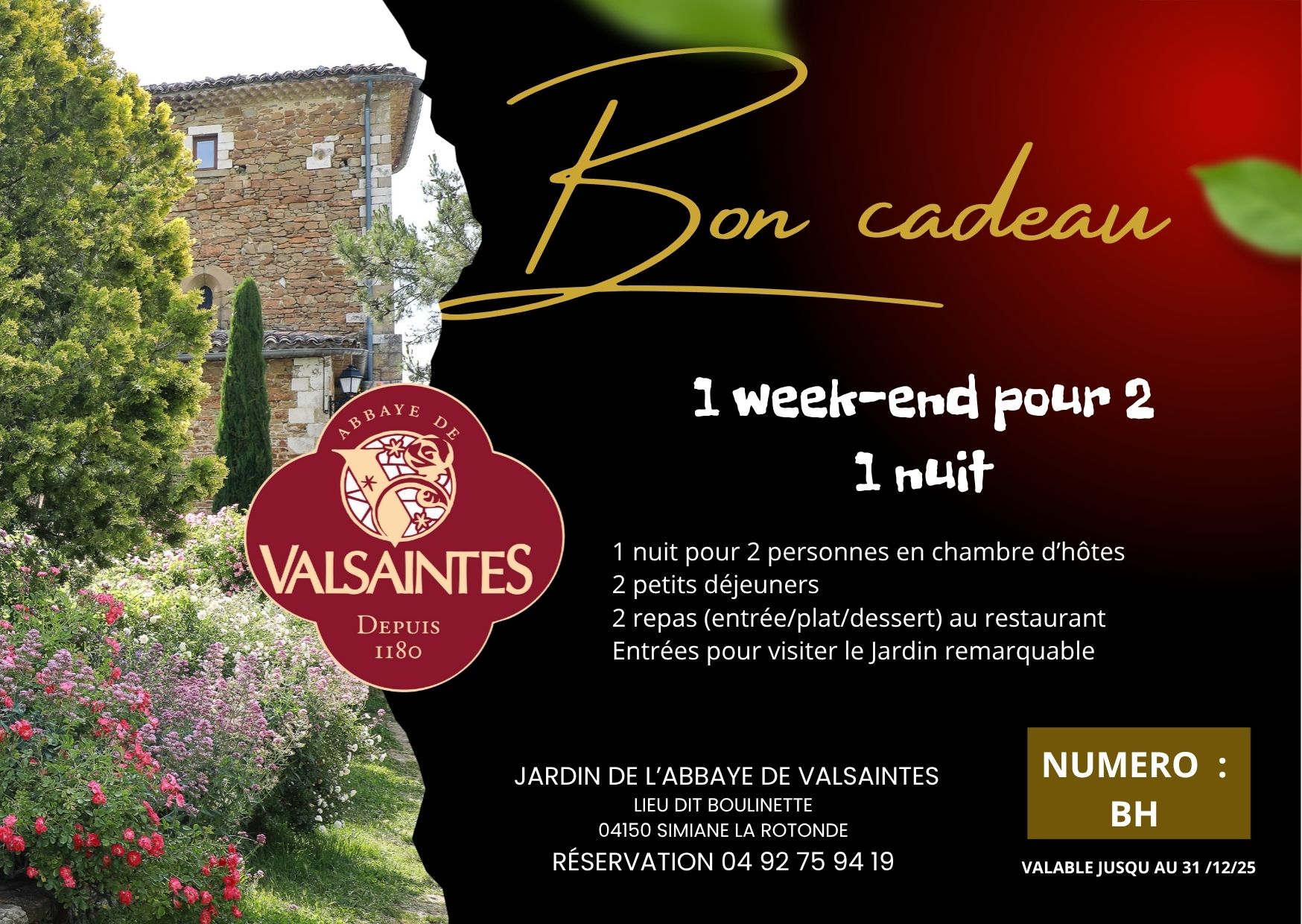 - 2 repas (entrée/plat/dessert) au restaurant du jardin de l’abbaye de Valsaintes