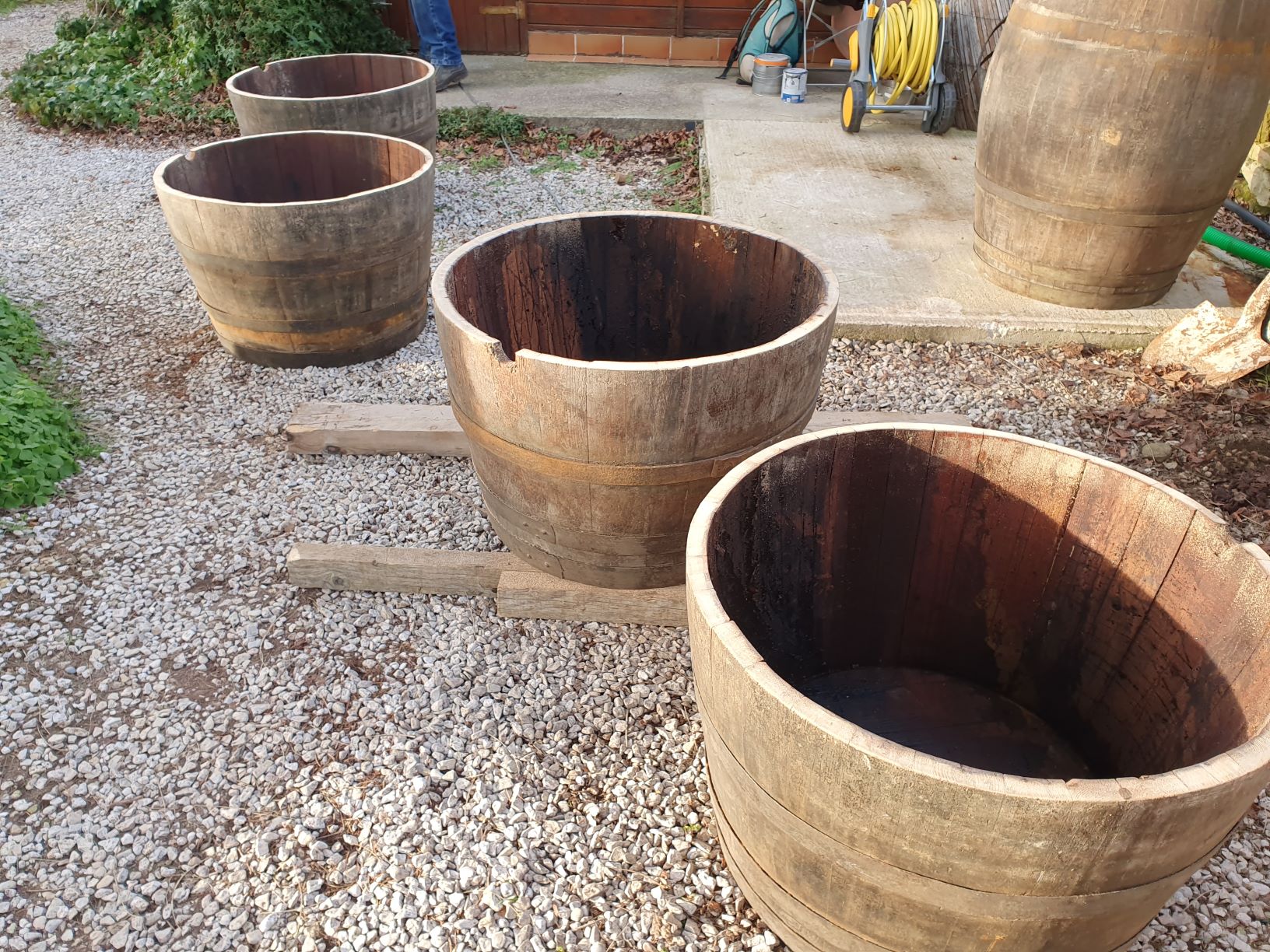 Nous avons récupéré des vieux tonneaux. Nous allons réalisé une nouvelle fontaine pour le jardin avec ces vieux tonneaux à vin. Nans s’est lancé dans dans les premières étapes de ce travail.