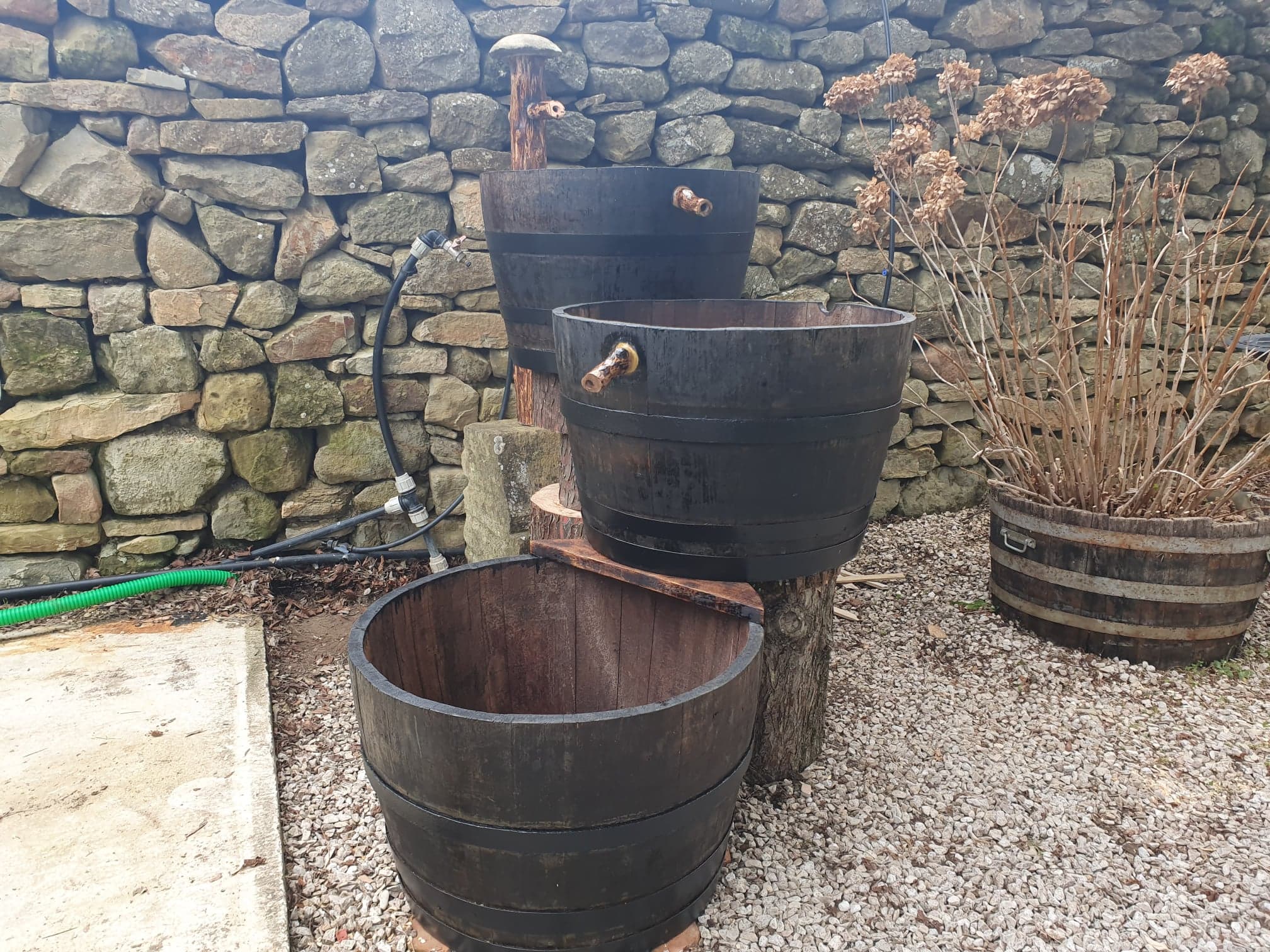 Le bois a été simplement enduit pour laisser la belle teinte naturelle des tonneaux tout le protégeant . Nans a ensuite fabriqué des robinets en bois avec des morceaux de bois dans lesquels il a inséré des petit bouts de tuyaux. Dans ses bacs, qui seront remplis d’eau et se déverseront les uns dans les autres, nous mettrons des nénuphars.