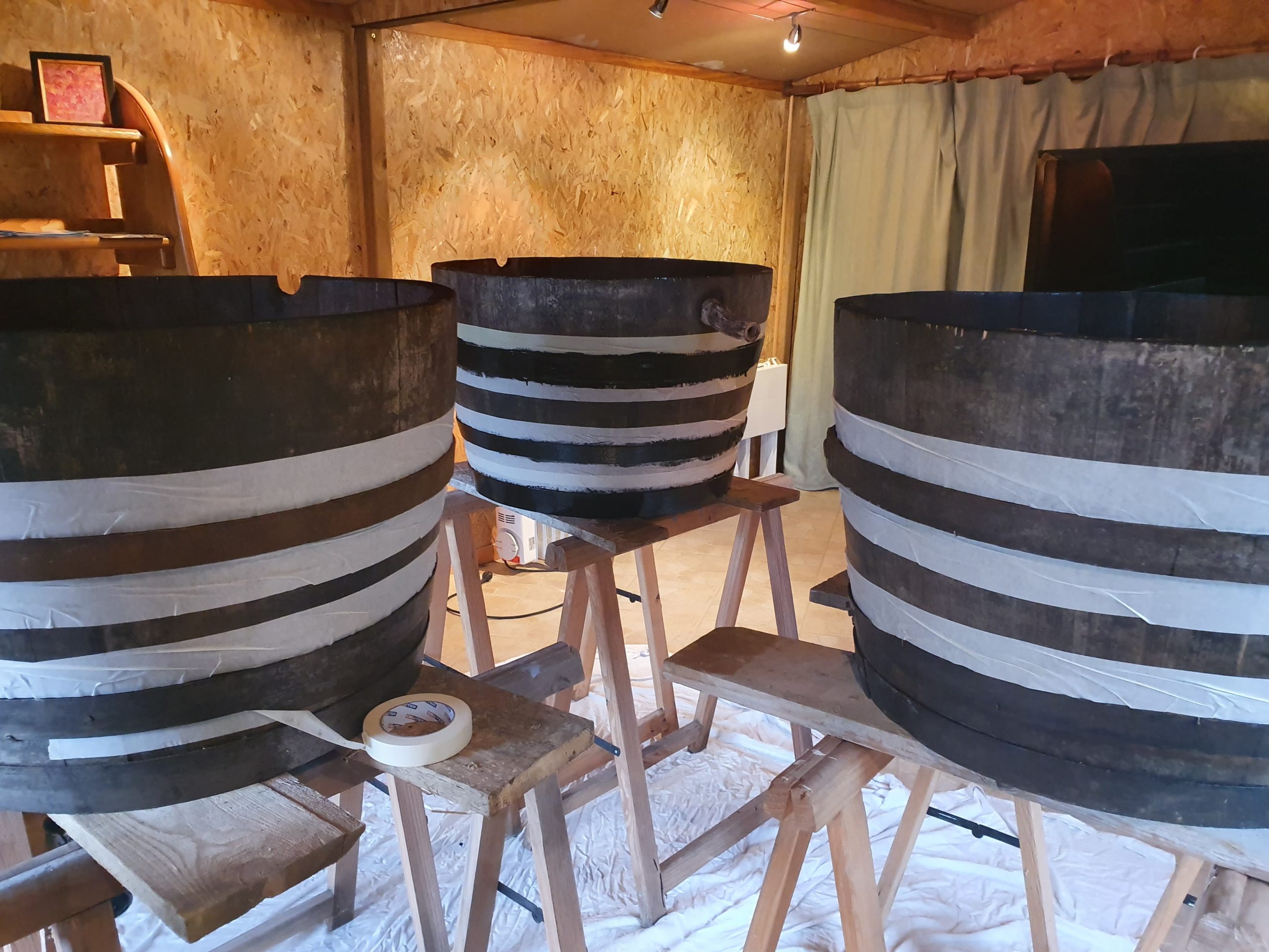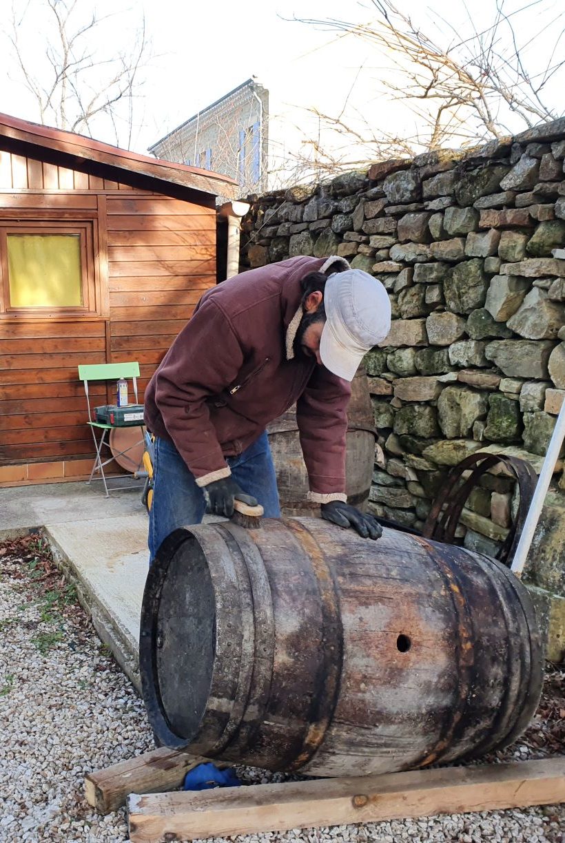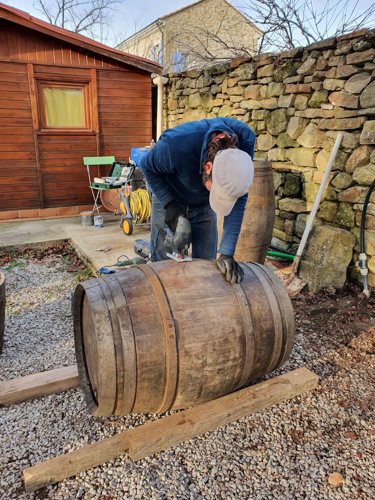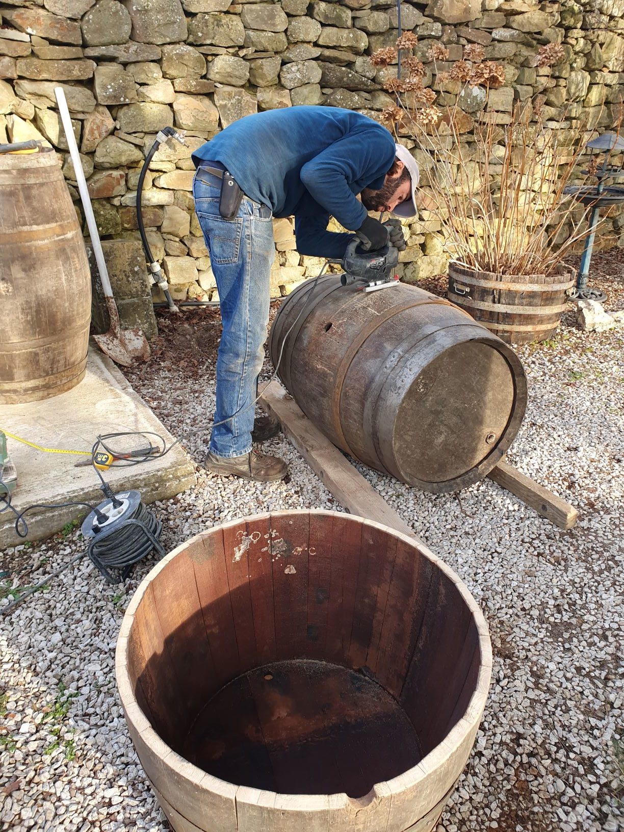 Il a tout d’abord enlevé les cerclages en fer pour pouvoir bien nettoyer et poncer les tonneaux mais aussi nettoyer les cerclages en fer qu’il a ensuite remis.