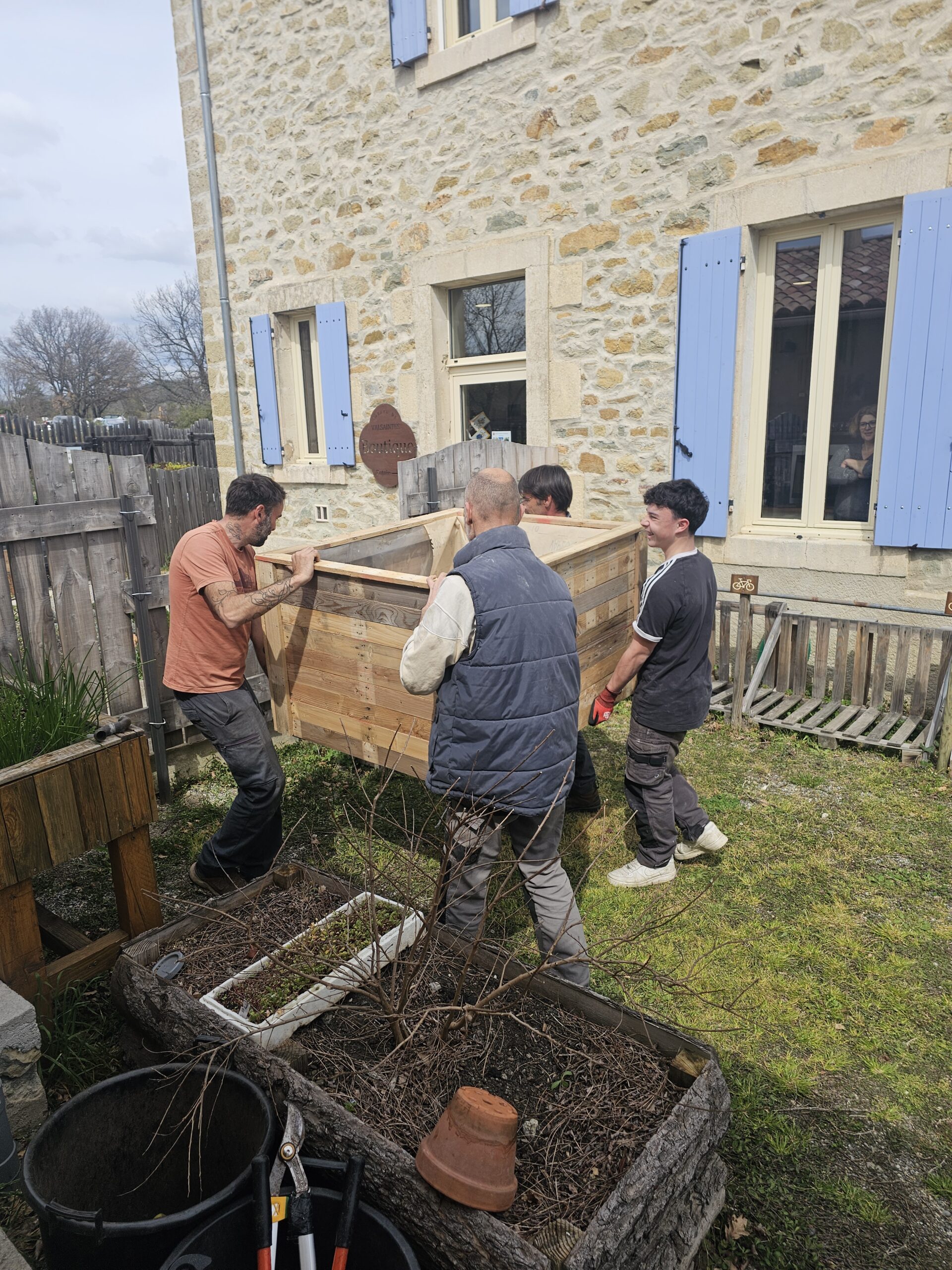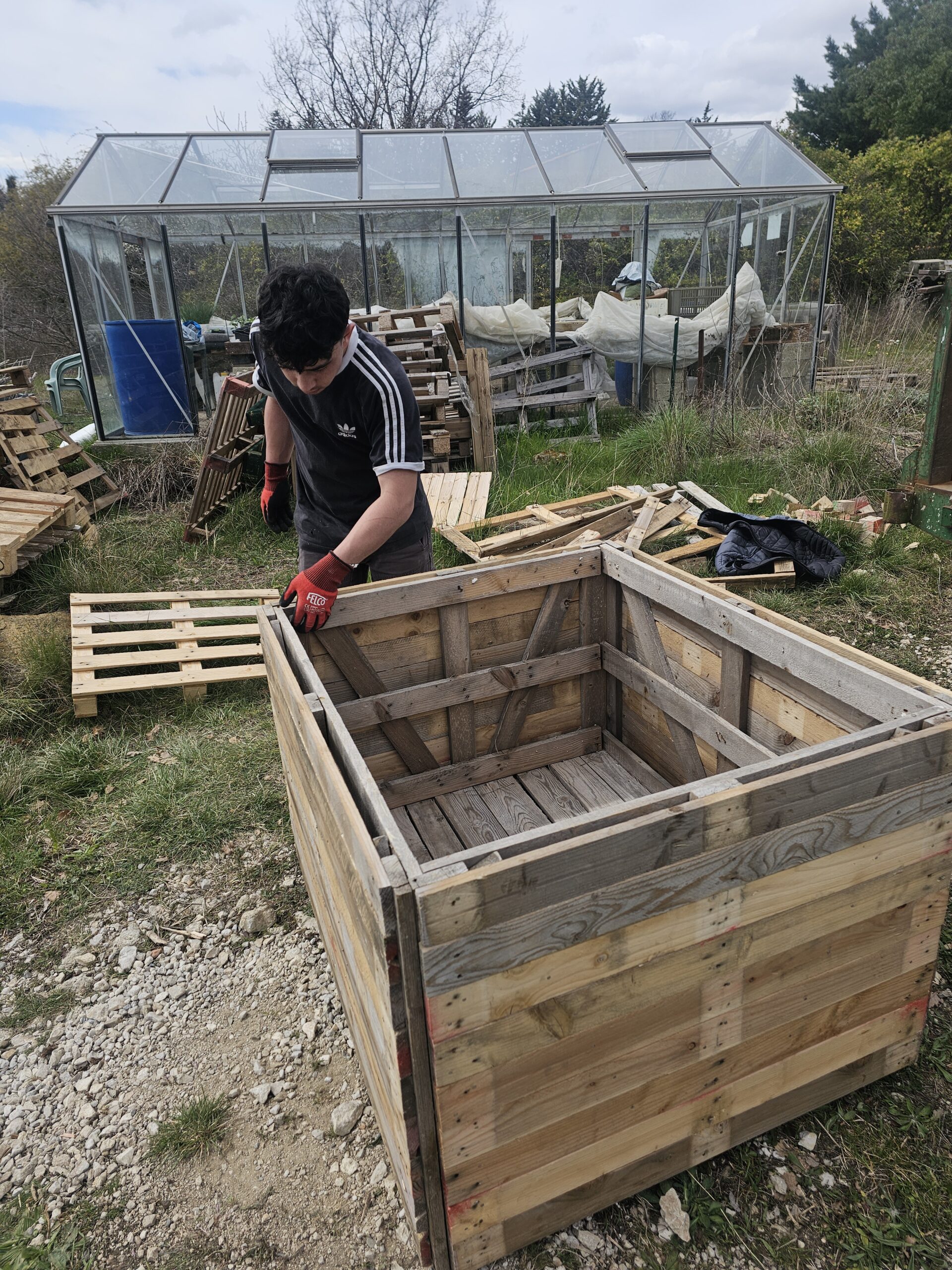 Nans (aidé de notre stagiaire Augustin) a une nouvelle fois fait usage de bois de récupération, avec un box palette de carrelage, habillé en extérieur de bois de palette et isolé à l’intérieur d’un film plastique. Ce gros volume est rempli d’un mélange terre de jardin, terreau et compost. Positionné entre la boutique et la cuisine du restaurant, il sera planté de basilics et autres herbes aromatiques pour aromatiser les plats du restaurant.