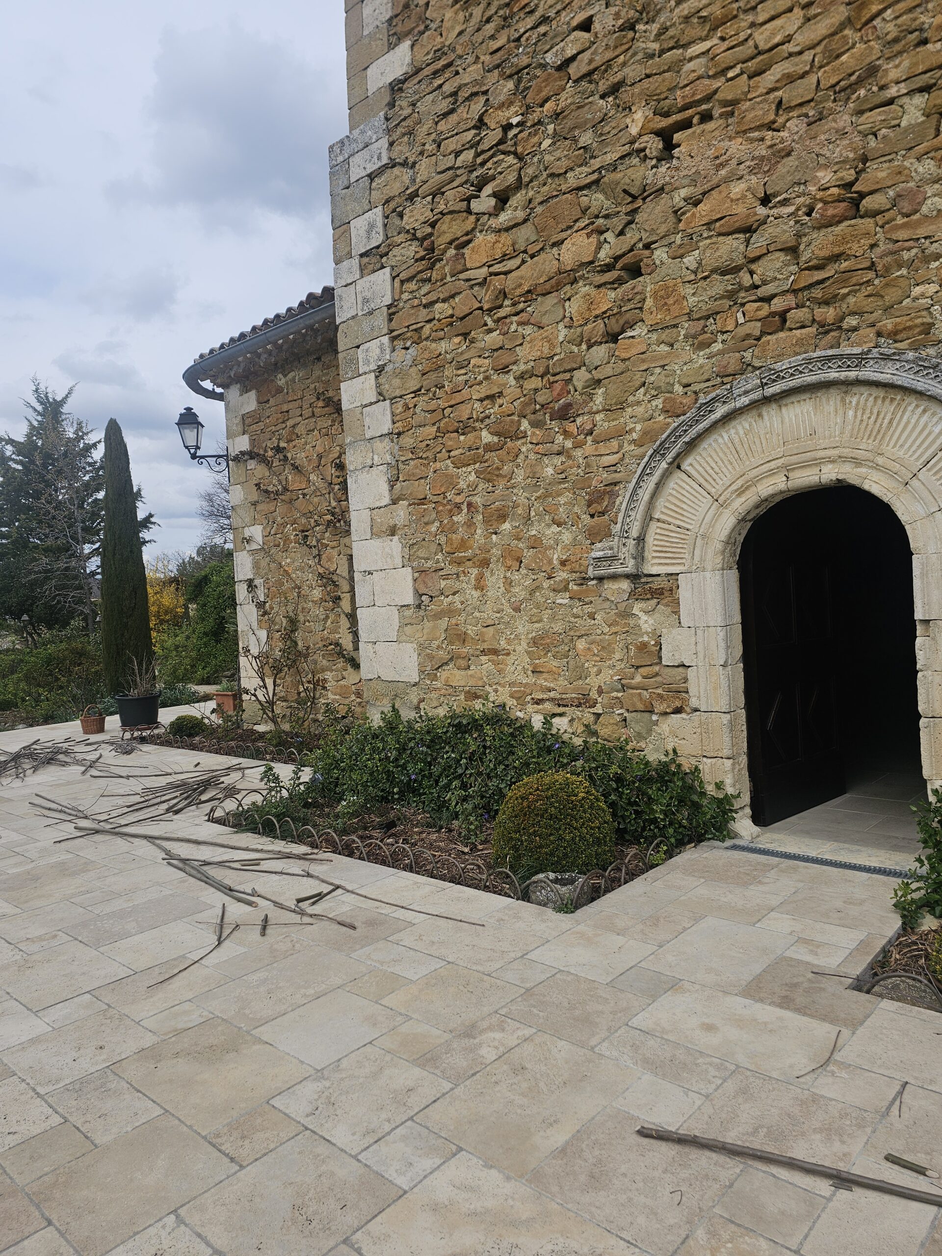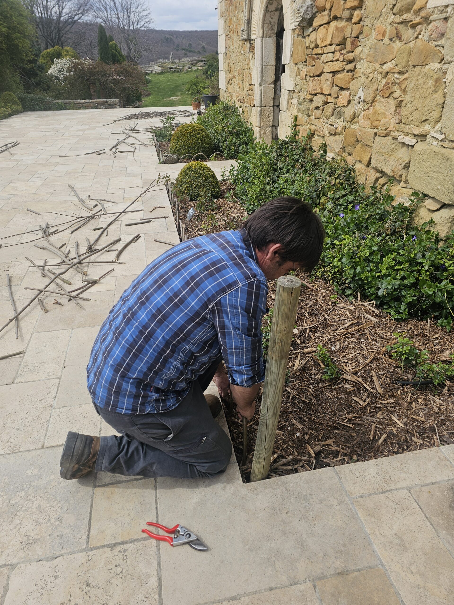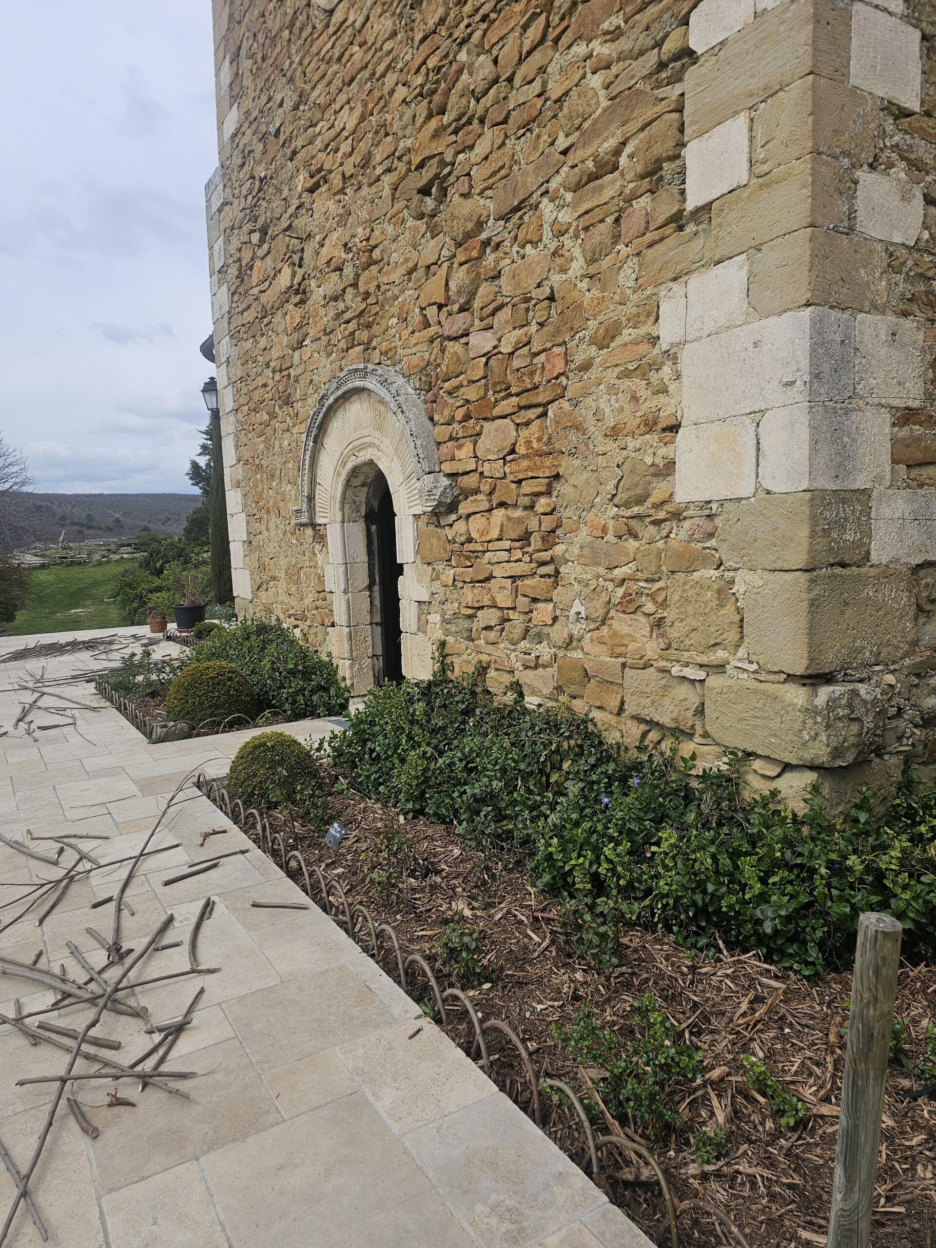 Nous utilisons beaucoup le bois de châtaigniers pour des aménagements du jardin. Nous avons la chance de pouvoir faire des coupes dans une ancienne châtaigneraie à 10 kms de l’abbaye. Olivier, jardinier depuis ce printemps avec nous, a suggéré de faire ces bordures en demi rond. Esthétiques, ces rameaux souples pliés ont pour but d’empêcher les pieds de visiteurs de se poser dans les massifs.