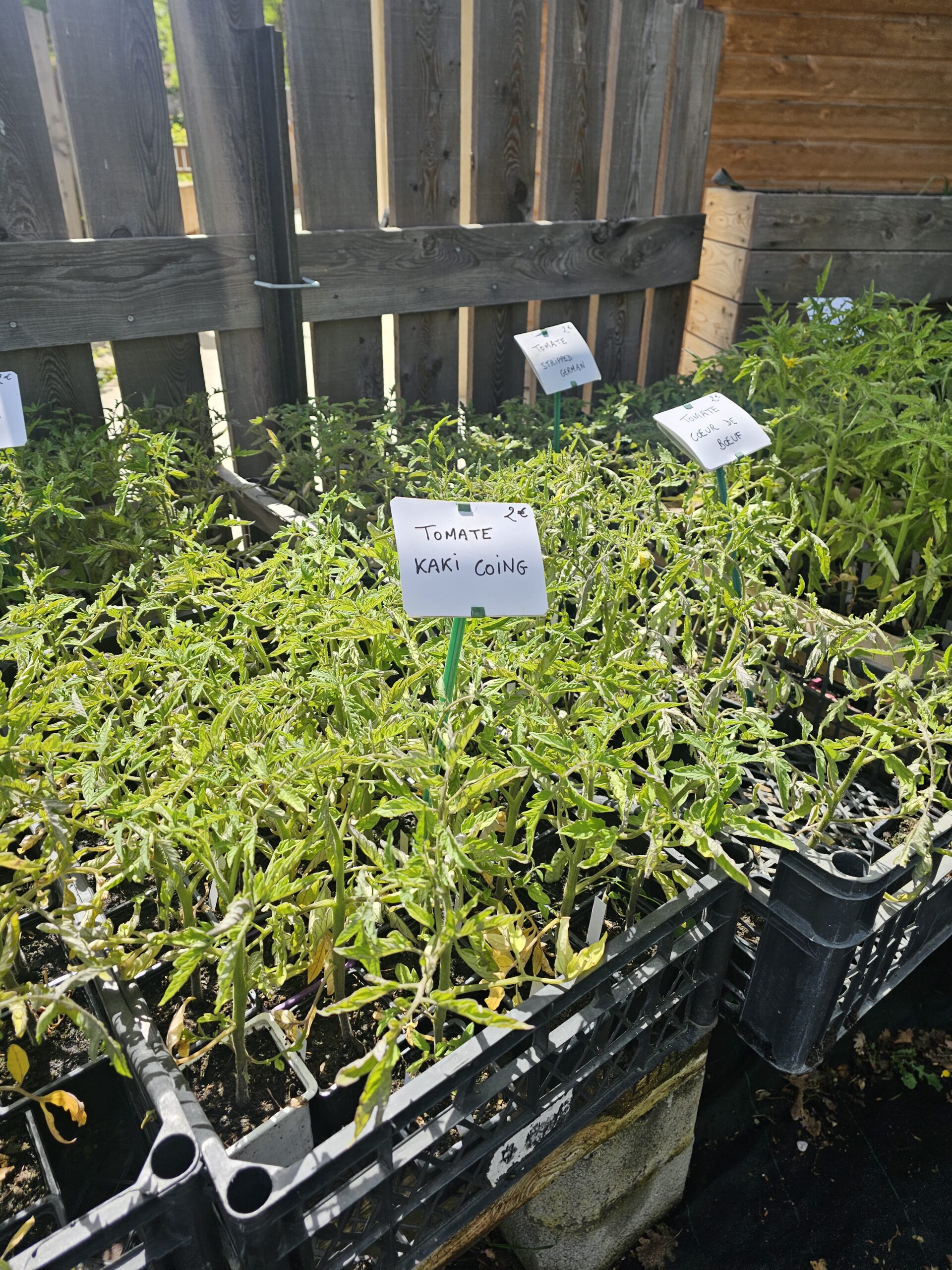 Dès le mois de février, nous avons semé sur couche chaude 50 variétés de tomates. Toutes nos semences proviennent de nos cultures précédentes. Des variétés reproductibles que nous avons sélectionnées et qui seront plantées dans notre potager. Ces semis ont été repiqué en godets et élevés sous abri. Plus de 1000 plants au total que nous mettons en vente. Du 15 mai au 15 juin, c’est le moment de les mettre en terre avec un bon apport de compost.