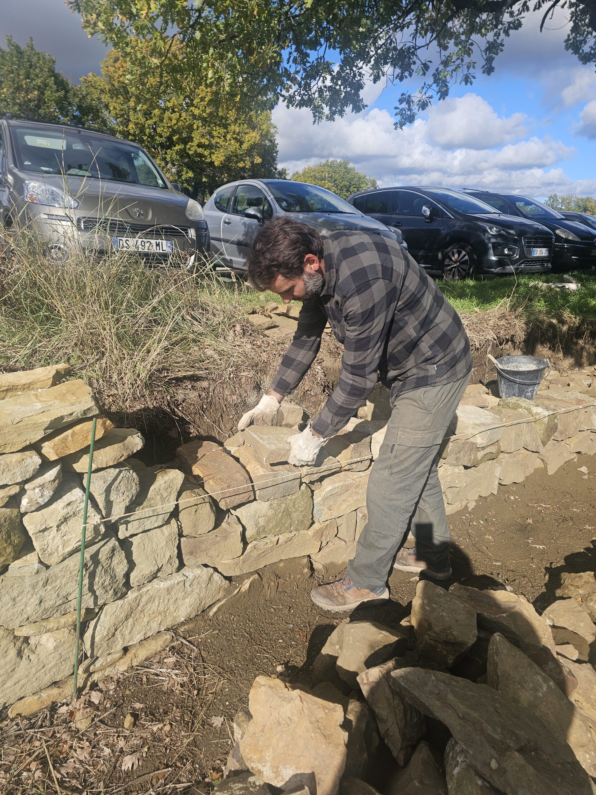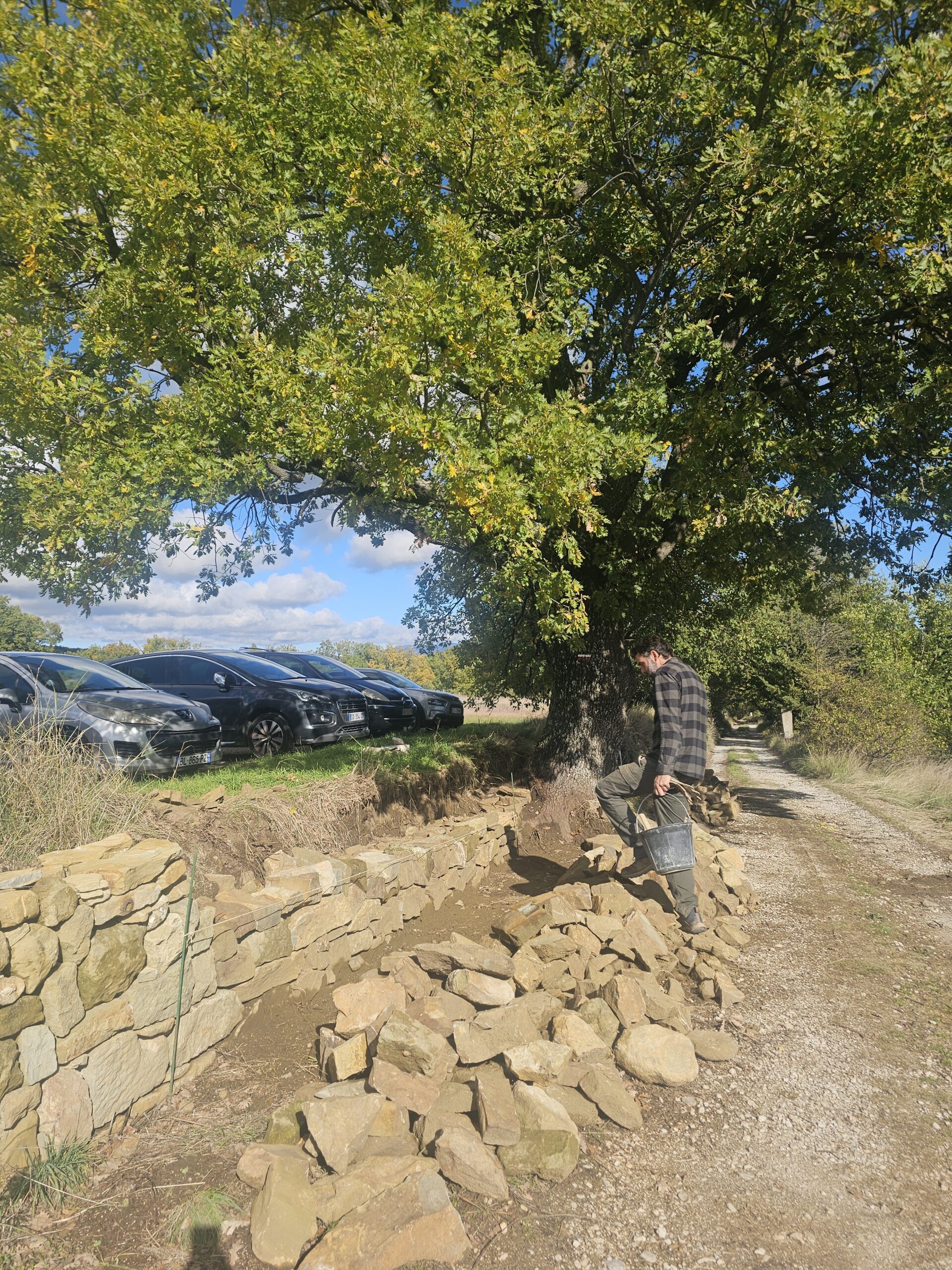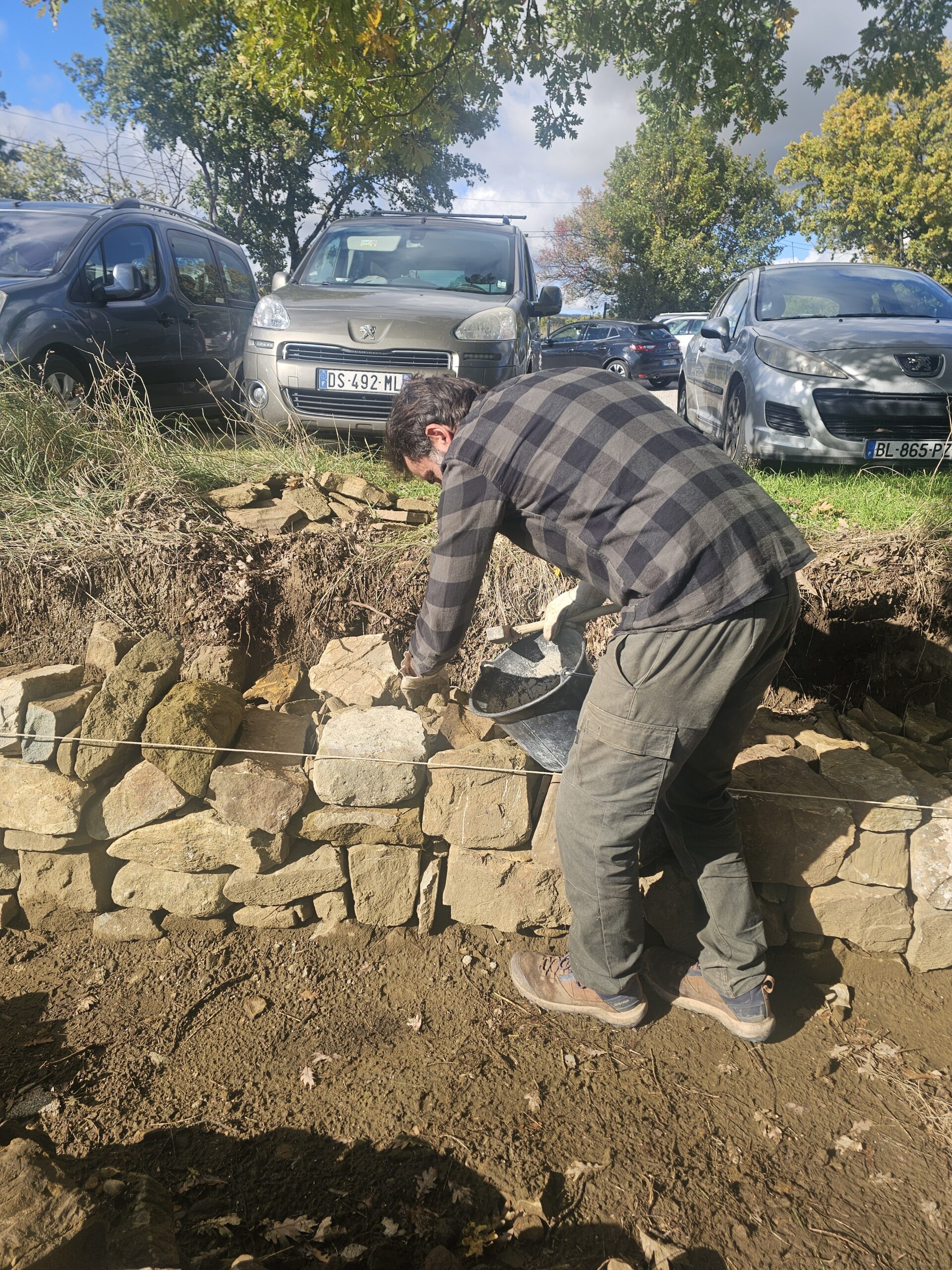 Comme chaque année depuis 30 ans, un chantier de restauration de muret de pierres sèches est en cours. Cette année Nans poursuit la reprise du muret de soutènement du terrain parking. Démontage complet, arrachage d’un vieux pied d’Aubépine que l’on ne pouvait garder dans ce mur. Le remontage se fait un peu différemment, avec plus d’épaisseur incluant à l’arrière une zone de drainage remplie de petites pierres. Avec cette méthode, les pluies fortes sont évacuées par ce drain et s’écoulent ainsi en pied de mur avec moins de forces.