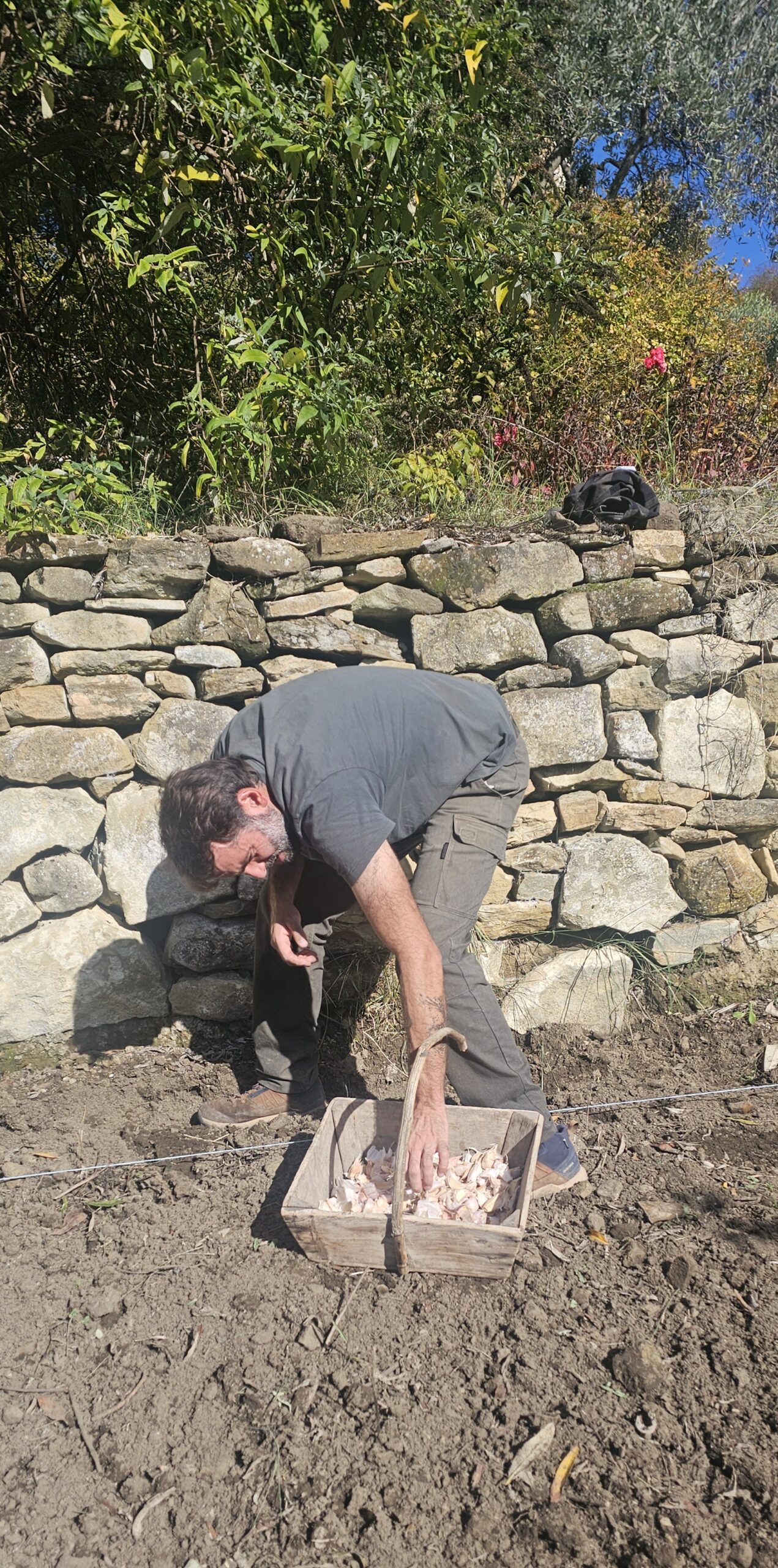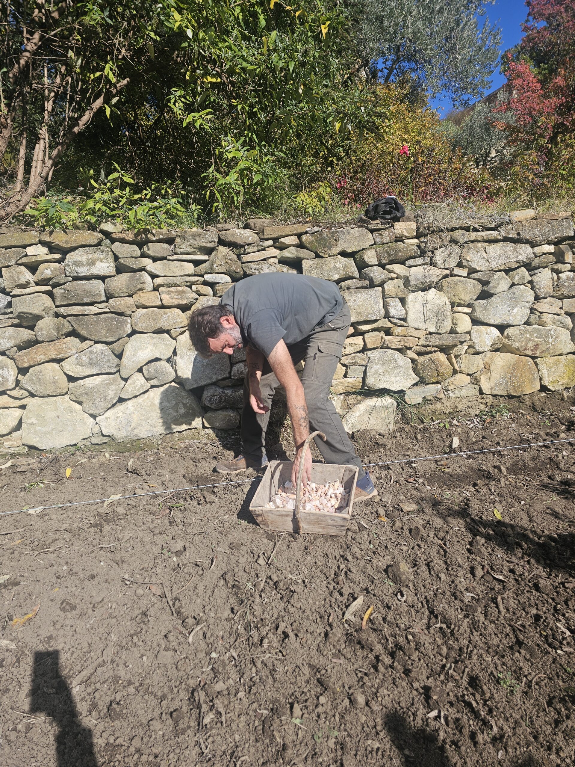 Comme chaque automne, nous plantons les bulbilles de légumes à cette période. Oignons et aïl, pas d’échalottes cette année, avec des bulbilles que devons acheter. Nous plantons sur une zone non arrosée du potager, très drainante en pied de mur. Pas d’amendements en humus pour ces légumes. Nous associons d’autres cultures avec un semis de petit pois et des repiquages d’épinards et mâches entre les rangs.