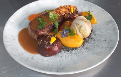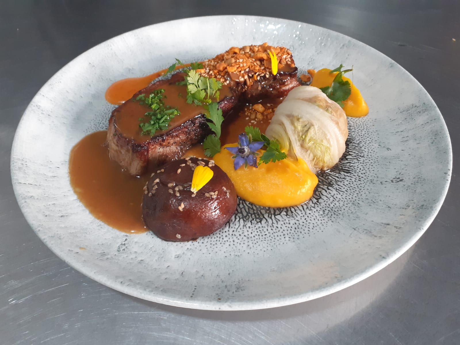 Poitrine de Cochon confite au poivre de sichuan, patate douce, choux chinois au gingembre et mélange dukkah 24 €