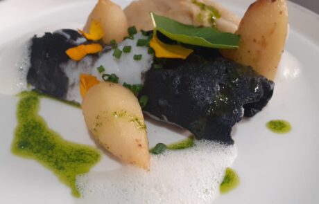 Voile d’encornets et anguille fumée, cerfeuil tubéreux 14 €